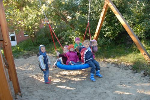 Oft geht es hinaus an den Strand, ins Watt oder in die Dünen. Ein schöner Spielplatz mit Häuschen liegt direkt neben dem Kindergarten. Es wird gebeten, das Gelände nicht zu betreten – hier sind die kleinen Insulaner unter sich!